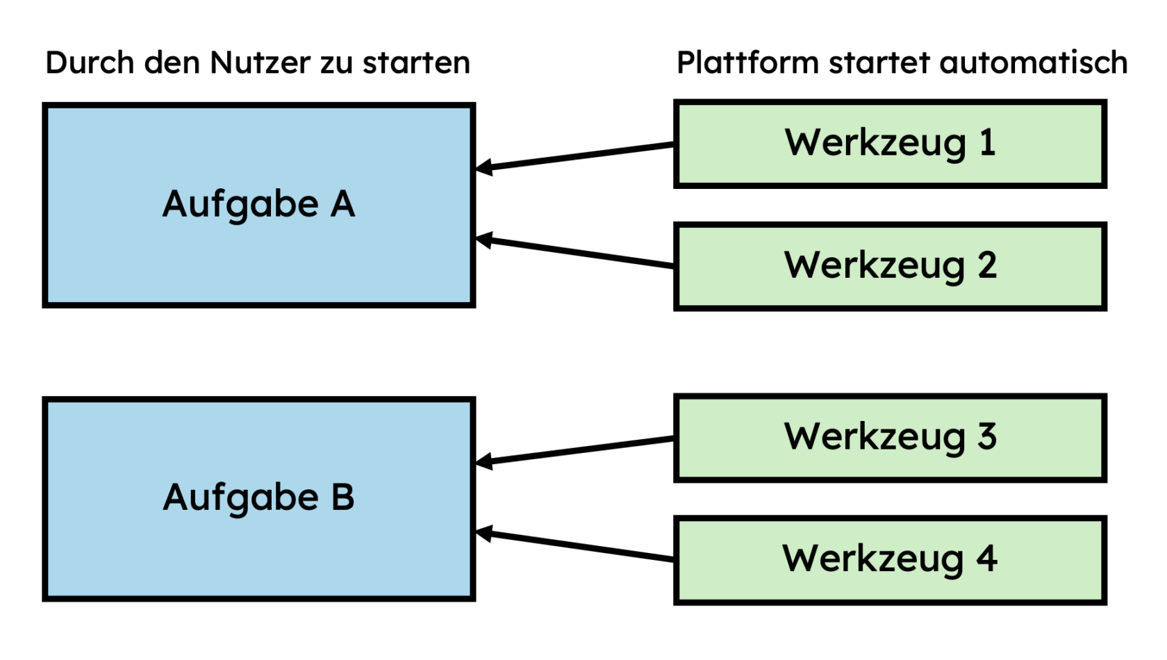 Nutzer starten nicht beliebig einzelne Werkzeuge, sondern bearbeiten eine konkrete Aufgabenstellung Schritt für Schritt. Die Bearbeitung folgt einem festen Muster: Zielklärung, kompaktes Hintergrundwissen, interaktive Bearbeitung und eine zusammenfassende Ergebnisseite. Im Hintergrund greifen die passenden Funktionen (Werkzeuge) ineinander und werden in fachlich sinnvoller Reihenfolge eingesetzt. Größere Vorhaben werden als Projekte gebündelt und führen durch mehrere aufeinanderfolgende Aufgaben.
