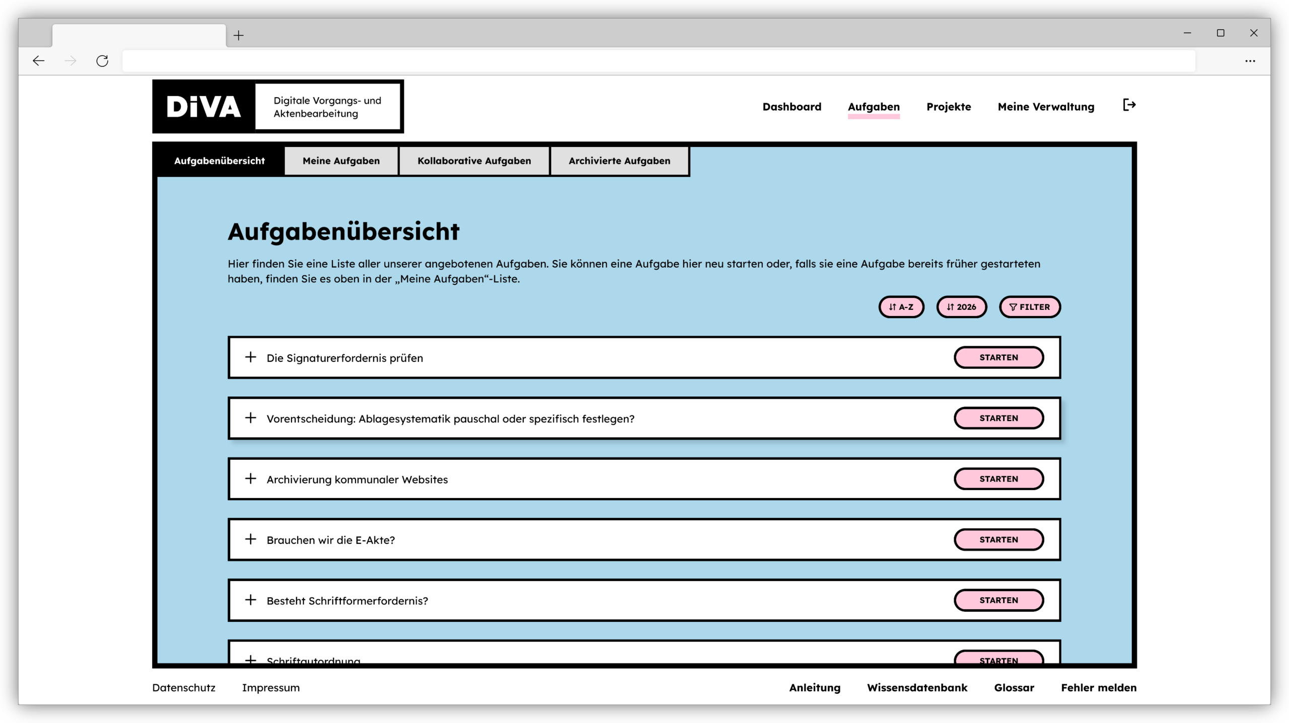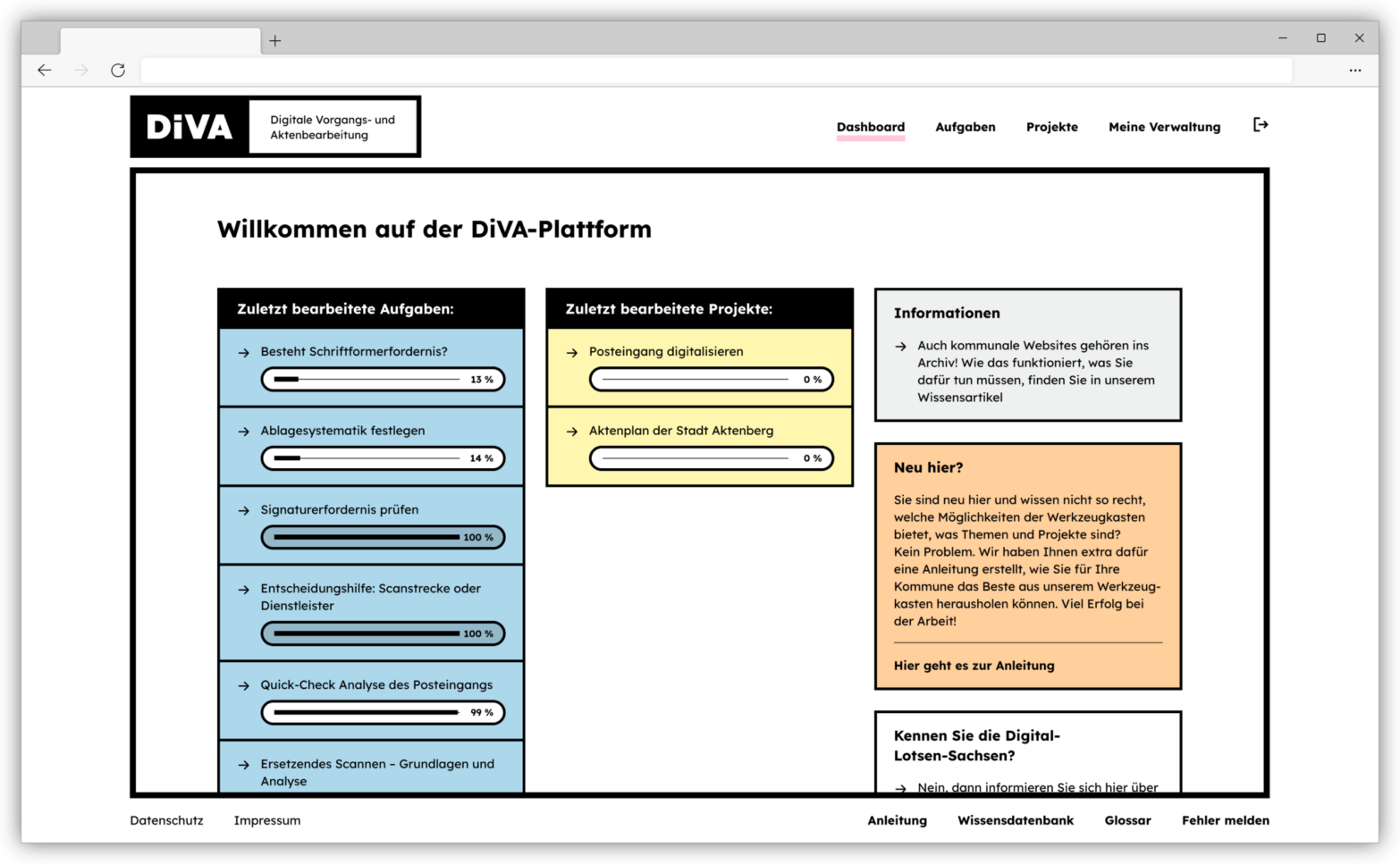 Die DiVA-Plattform ist eine webbasierte Arbeitsumgebung für Aufgaben und Projekte rund um die Themen E-Akte, Dokumentenmanagementsysteme und angrenzende Fragen der Verwaltungsdigitalisierung. Sie unterstützt Kommunen dabei,
